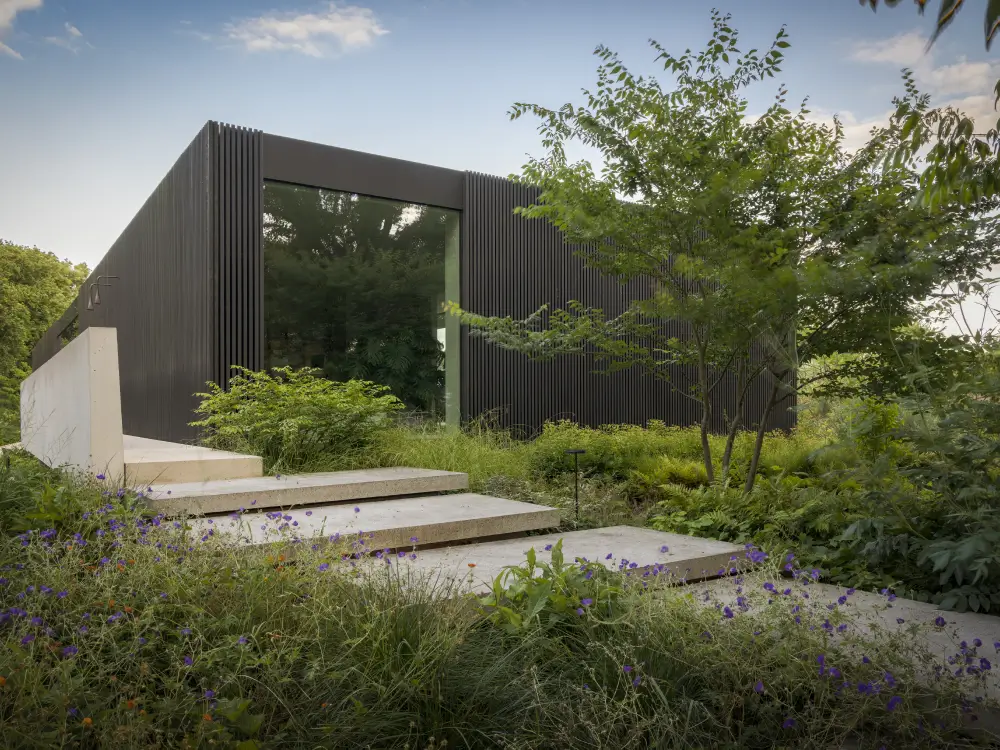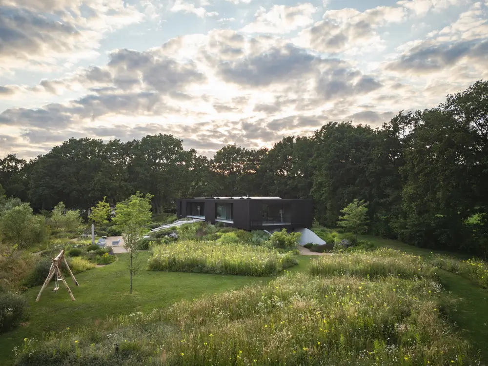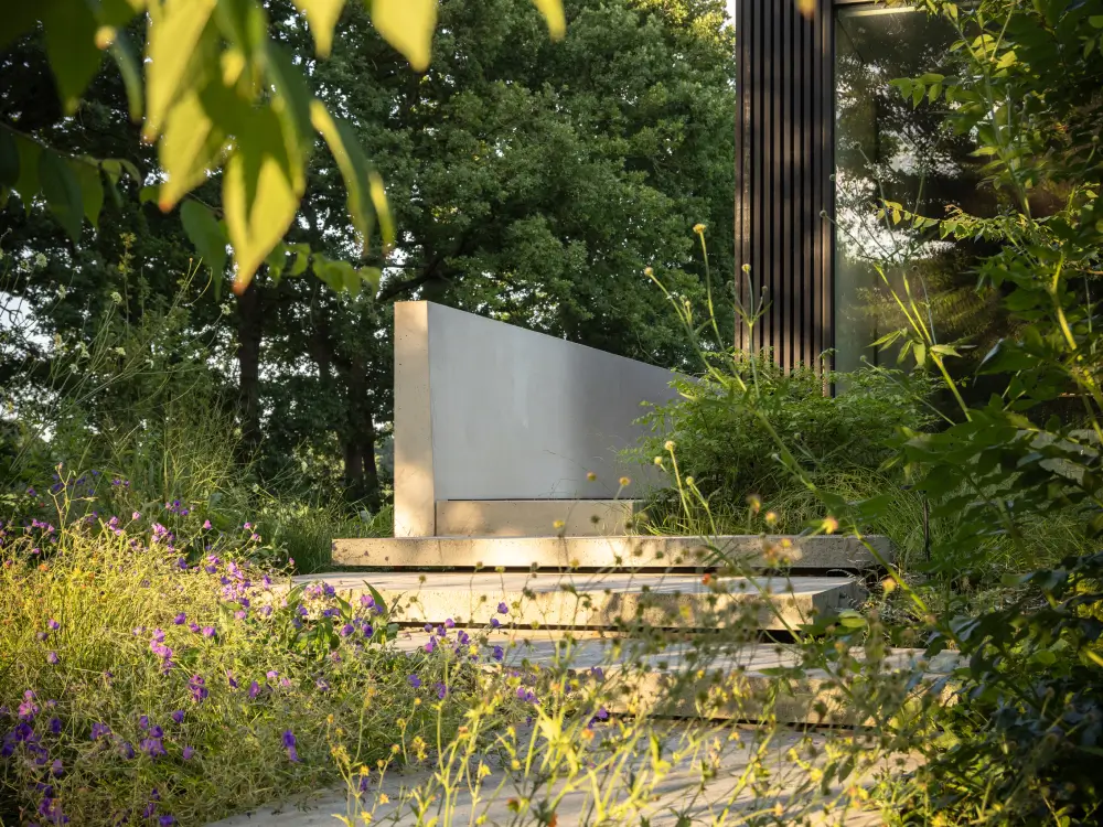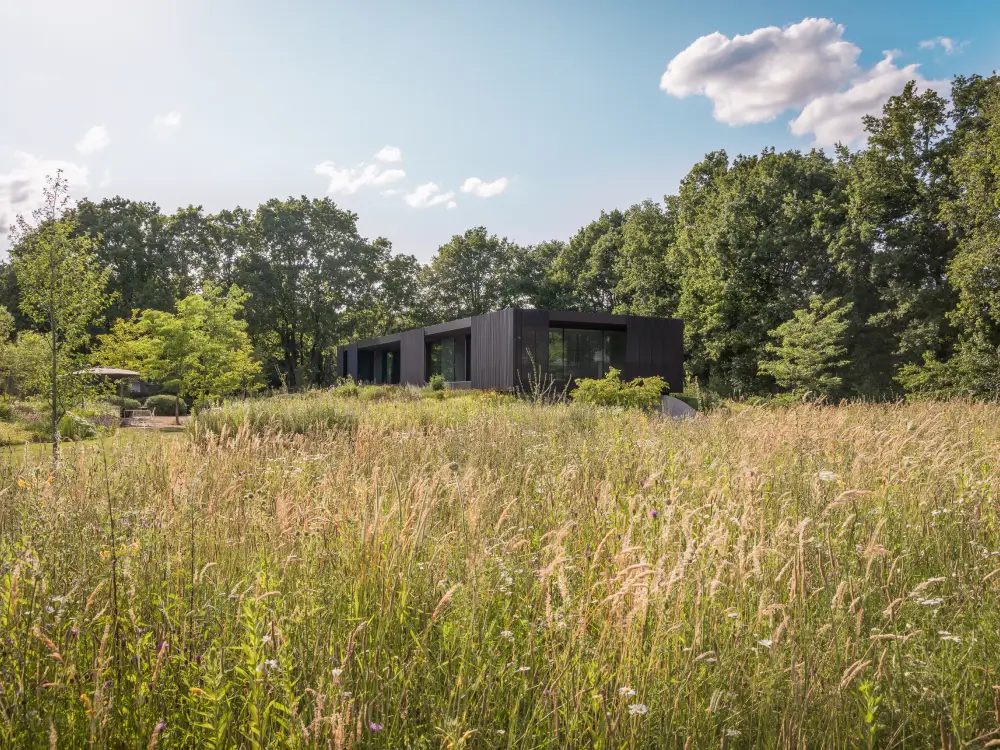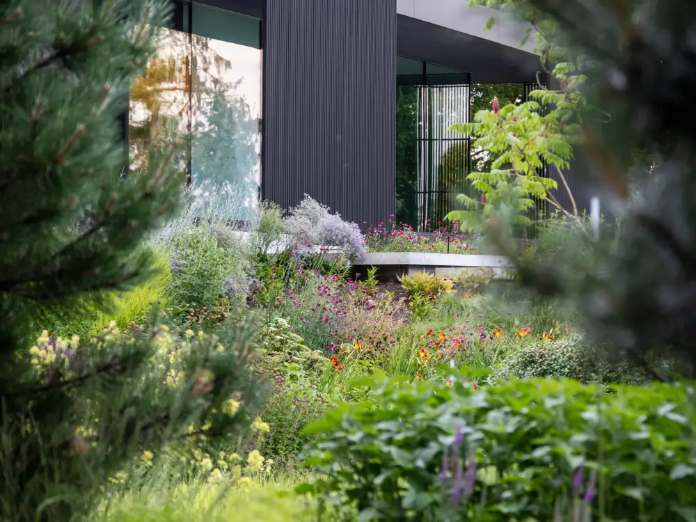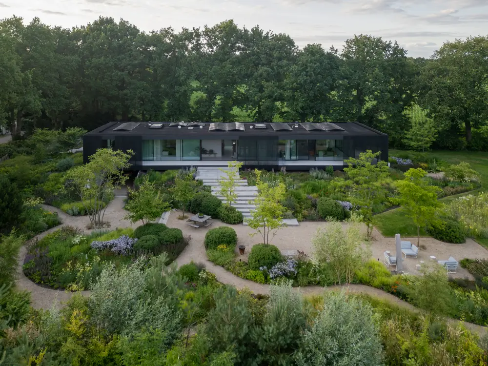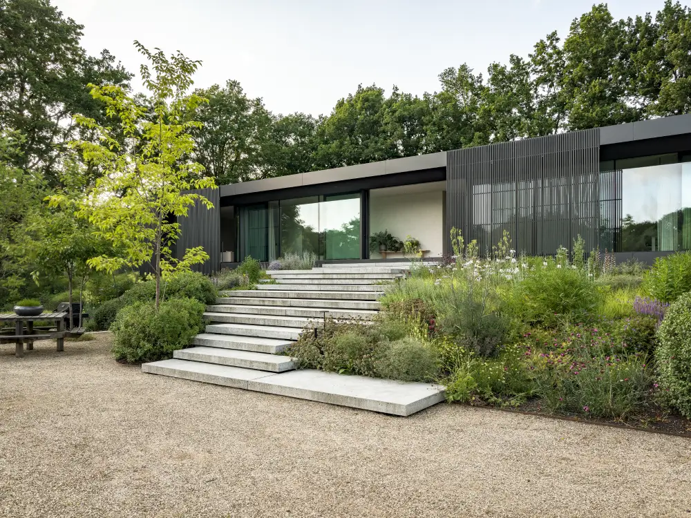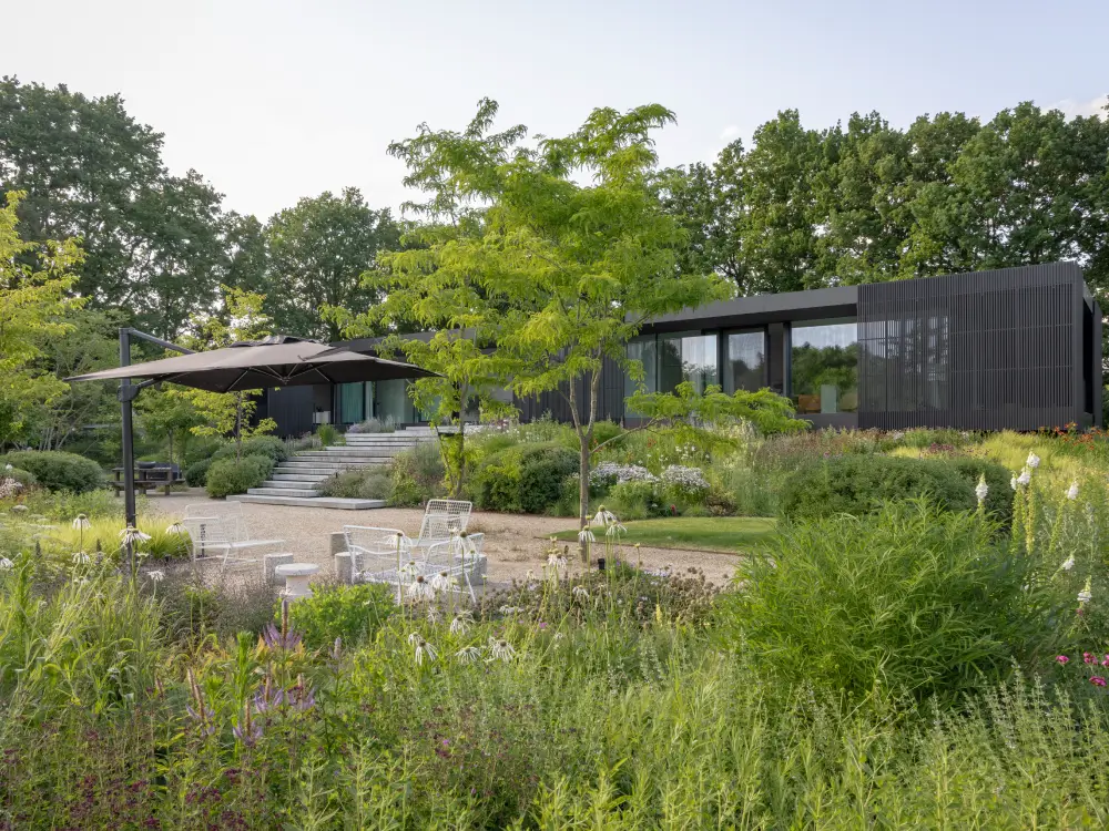 Rondom de woning vind je trappen, looppaden en terrassen, omgeven door weelderige borders. Verderop vloeit de tuin vanzelf over in het omliggende landschap, met grote bloemrijke vlakken en gazons. Zo ontstaat een natuurlijke overgang tussen privéruimte en natuur, precies waar wij als PULS Exclusieve Tuinen van houden.