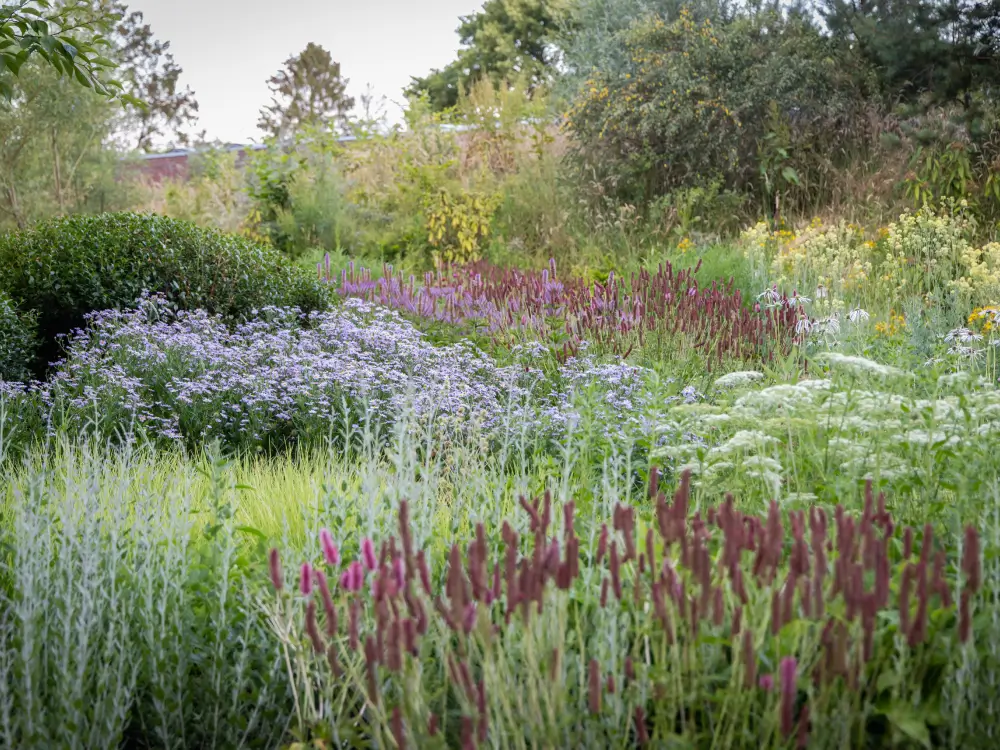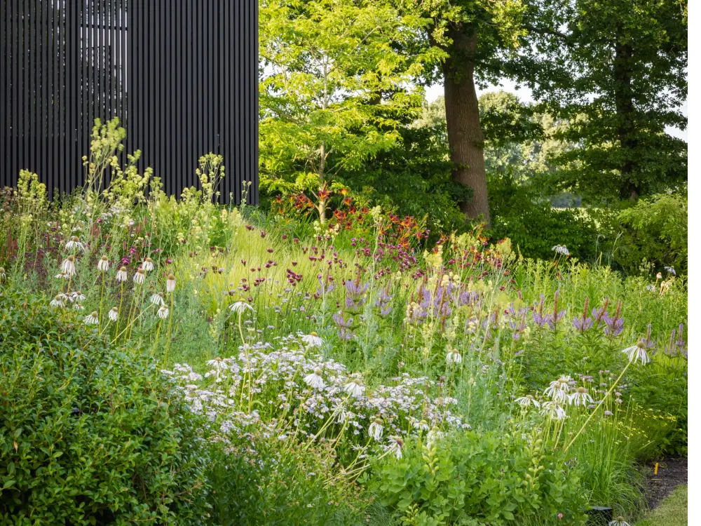 Frank Heijligers maakte het geheel compleet met een schitterend beplantingsplan in de stijl van Piet Oudolf. Een natuurlijke gelaagdheid van vaste planten, siergrassen en (meerstammige) bomen zorgt voor ritme, beleving en seizoenswerking, het hele jaar door.